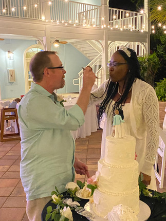 Vicky's sons walked her down the aisle and Vicky's daughter was her Maid of Honor and walked the couples' dog Lacey down the aisle. the DJ officiated the ceremony, where they took turns every other sentence to read their vows to each other, which were super cute and personalized. Bubbles flew in the air when they were pronounced as husband and wife and took their recessional walk. As day of planners in the Florida Keys, we are there to make sure all the bubbles get handed out and we give instructions to the guests. We took care of setting up the memorial table, the sand ceremony and their whole arch.